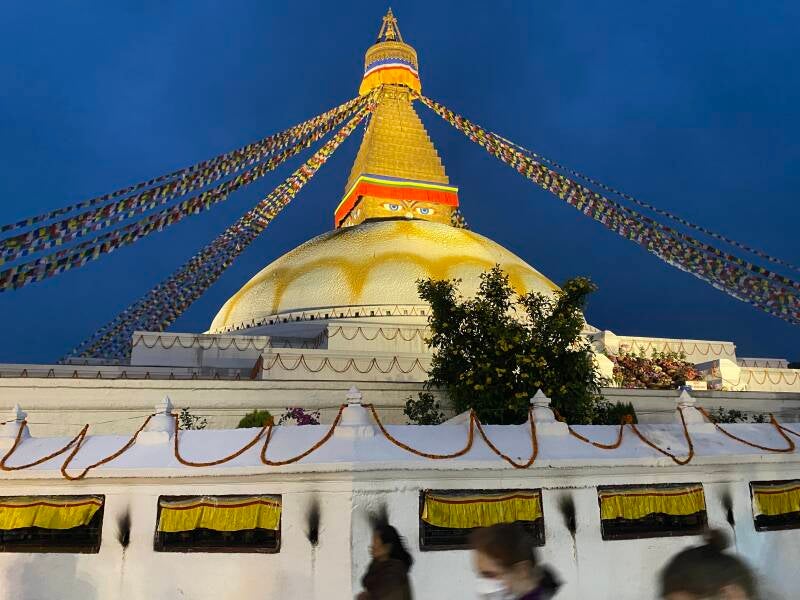 Будханат – огромная буддийская ступа, где содержится изображение 1000 Будд. Хождение вокруг ступы вводит в поток. Идешь по кругу, с незнакомыми людьми и читаешь про себя мантру. Можно крутить молитвенные барабаны, можно подняться на ступу и обойти ее по верху. Сверху пристально смотрят два глаза, нарисованные на самой верхушке.