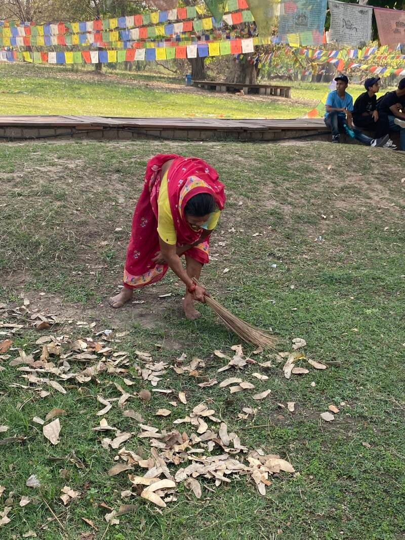 Лумбини находится на уровне моря, и там всегда более жарко, чем в столице, которая находится на высокогорье. Когда наш автобус приехал в Лумбини в третьем часу дня, мой телефон показывал +39 градусов цельсия. Мы поехали не в гостиницу, а сразу же к месту рождения Будды. Был огромный соблазн остаться в кондиционированном автобусе и не идти смотреть на руины под палящим солнцем. Но что-то внутри мне подсказало идти. Думаю: «ненадолго ведь. Минут двадцать, и поедем в гостиницу». Как бы ни так! Это удивительное место обворожило нашу группу часа на полтора. Огромные вековые деревья бодхи величественно стояли, расправив ветви и листья, развевая буддистскими флагами. Они были главными свидетелями этого места. У них не было конкуренции. Они росли на довольно больших расстояниях друг от друга, и возможности все время ходить по тени не было. От деревушки, где Сиддхарта Гаутама прожил первые двадцать лет, остались лишь каменные основания домов, но ощущение было того, что здесь до сих пор смеются, торгуют, болтают и живут люди в ярких одеждах. Место было живое. Это трудно передать словами, но тело это четко чувствует. Что-то там экскурсовод нам рассказывал, но я ничего из этого не помню. Помню маленькую бабульку, с усердием подметавшую пыль посреди степи, под одним из деревьев. Помню индийскую семью, приехавшую из Индии, которая там совсем рядом, через границу. Помню ворон, которые летали с дерева на дерево. И помню, как, когда уже силы были на исходе, я подошла к одному из деревьев бодхи и попросила его помочь мне. «Одна я не выдюжу, помоги мне, пожалуйста, поддержи!» Я стояла и молилась. В это время одна из участниц поездки сделала мою фотографию и потом с восторгом подошла поделиться результатом: на фотографии на меня светил лучик света с самой верхушки дерева… Удивительно еще то, что мне становилось все лучше и лучше физически.