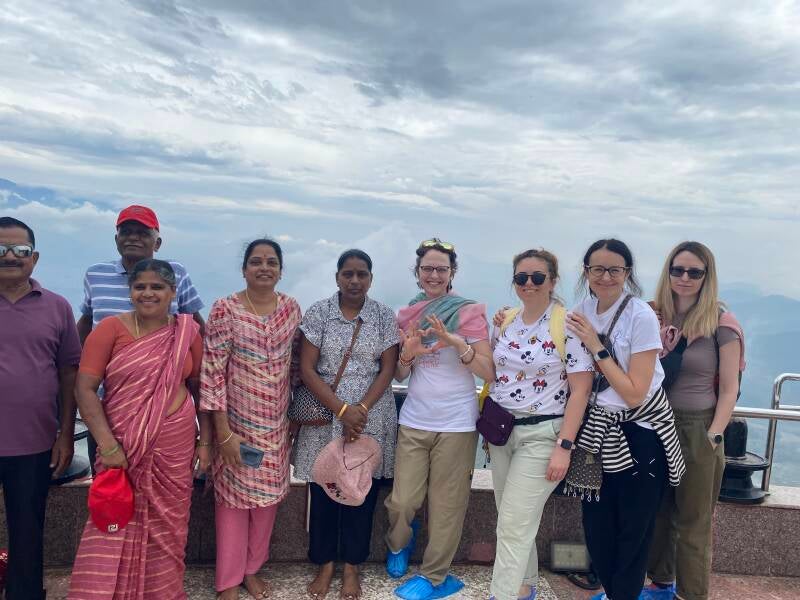 Отсюда же, со смотровой площадки, сразу за долиной с озером, вдруг открываются гряды Гималаев. Наконец-то я их увидела! Я стояла, впитывая в себя сине-белые гряды гор, прямо как у моего любимого Рериха. Хотелось все это сохранить у себя в сердце. Я не долго пребывала в одиночестве. Ко мне подошла познакомиться женщина из Индии. Она учительница, приехала с семьей посмотреть Пумдикот. «Пусть будет мир во всем мире и пусть все люди дружат» – вот об этом мы говорили на вершине храмового комплекса Шивы с видом на Гималаи. Когда видишь такое величие, то ни о чем меньшем думать не хочется.
