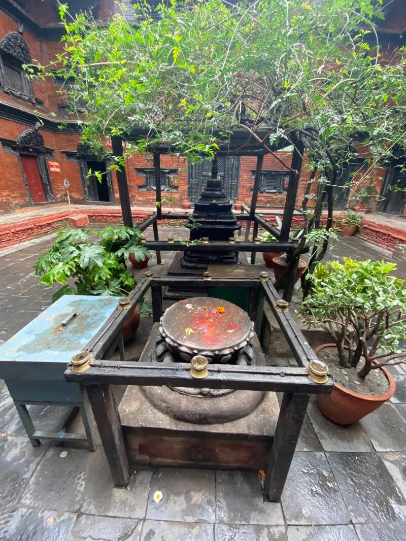 We entered a small courtyard with carved window shutters and intricately carved doors. A crowd of tourists slowly gathered, hoping to see Kumari. She appears on her balcony only twice a day. How fiercely Rama scolded anyone who tried to pull out a camera or phone! How he protected and guarded the little goddess from intrusive visitors! He showed everyone that they needed to be respectful and fold their hands in namaste.