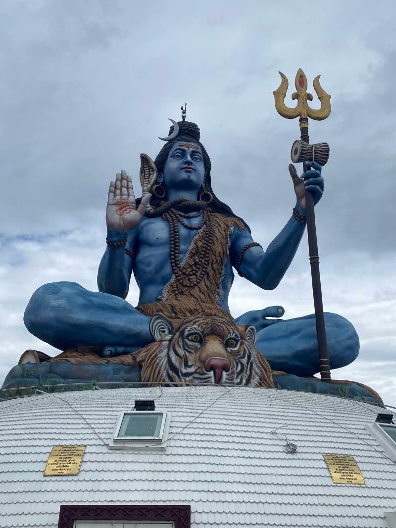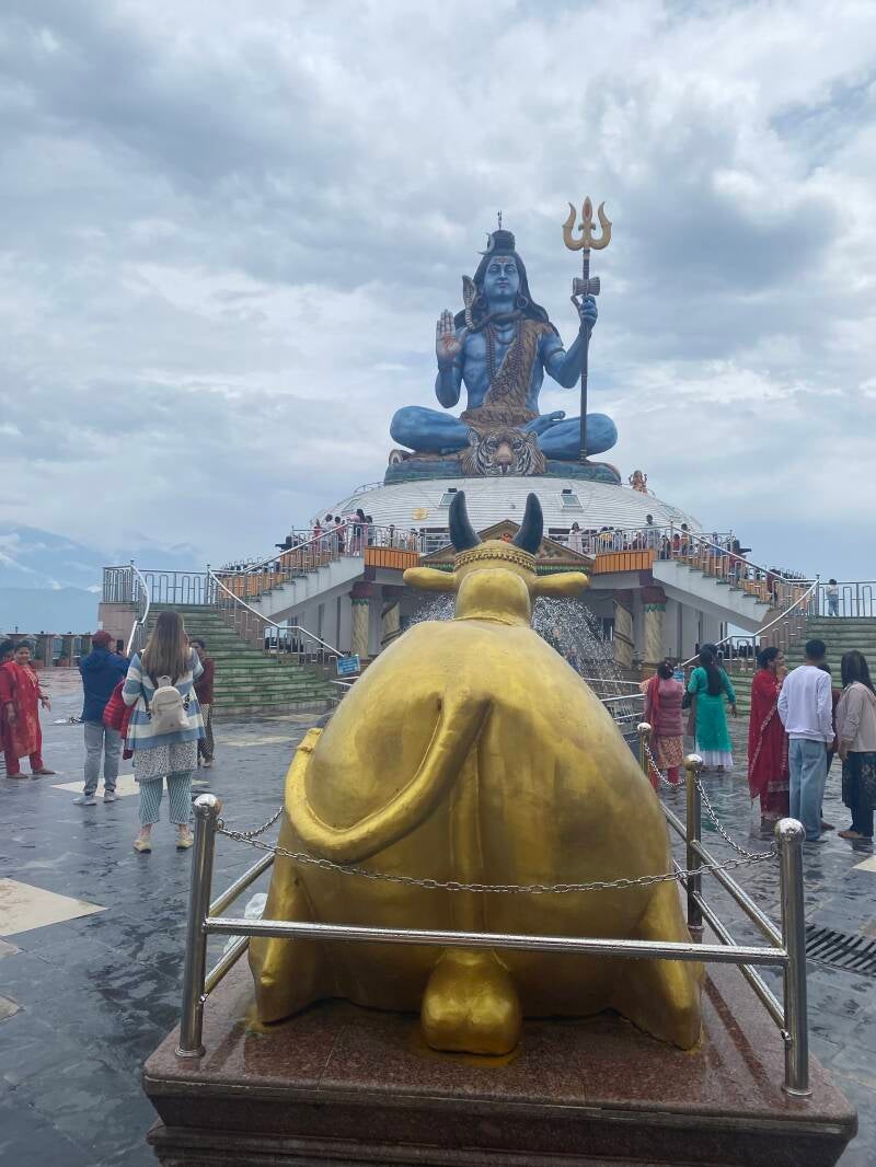On two neighboring hills rise the statue of Shiva and, opposite him, the statue of Parvati in her form as Durga. Yang and yin on opposing hills, set against the backdrop of the Himalayas, immediately bring a sense of bodily harmony. The 15-meter-tall Shiva sits on a tiger skin, entwined by a formidable cobra, a trident in his hands. Before him stands the golden bull Nandi—Shiva’s patient companion. He is patient, ready to wait for his lord for as long as it takes.