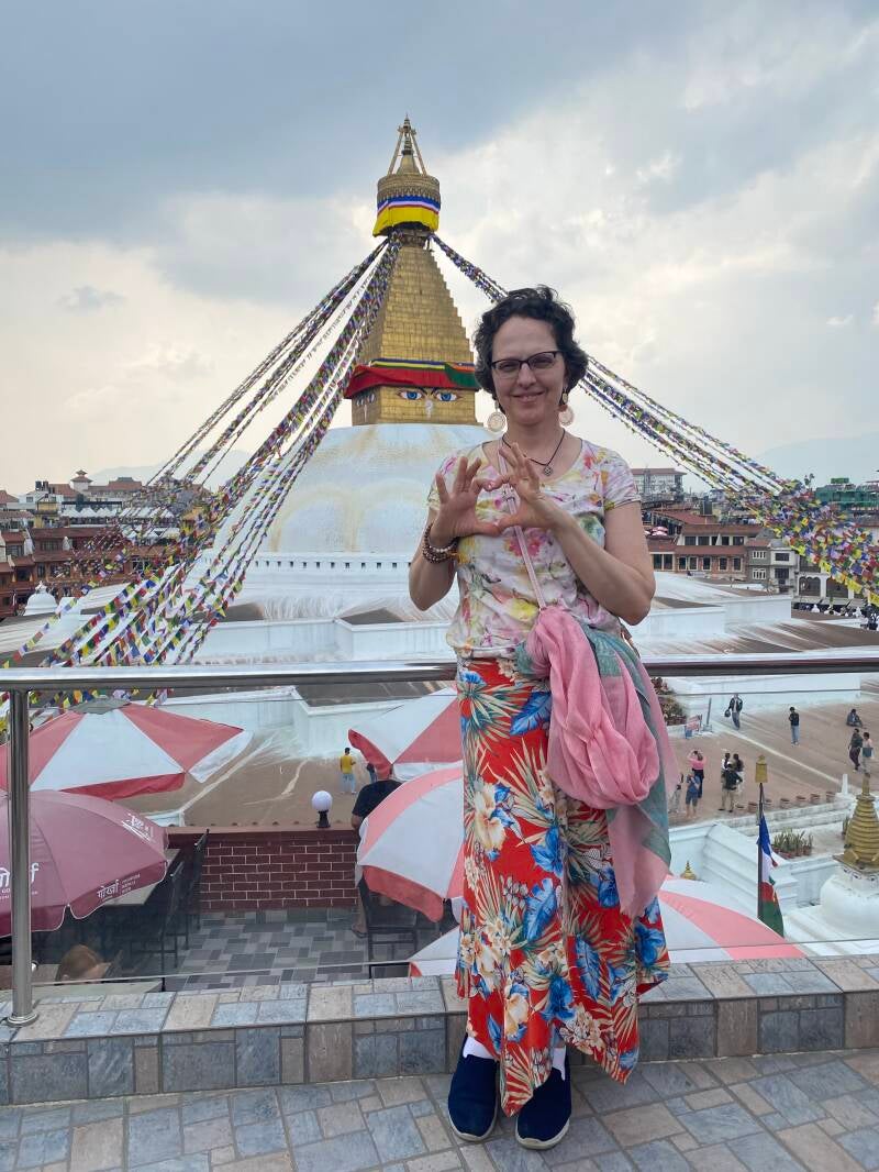 The second time, I came to the stupa with a group of women pilgrims. Joy began playing inside me already on the way there. I loved everything about this place: the beauty of the temple, the grandeur of the site, the cozy café on the second floor where you could look straight into the stupa’s intent eyes, and the countless souvenir shops. Drinking masala chai, I gazed at all this beauty in fascination, and my heart was large enough to hold everyone and everything.